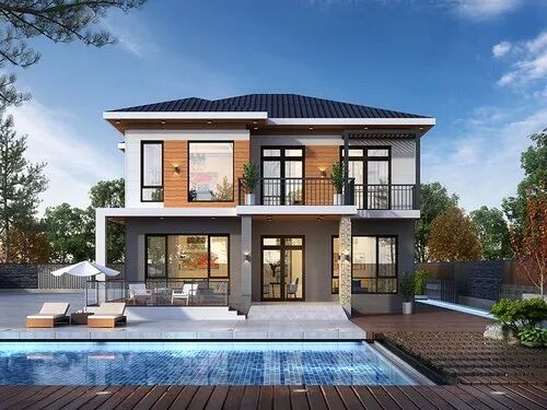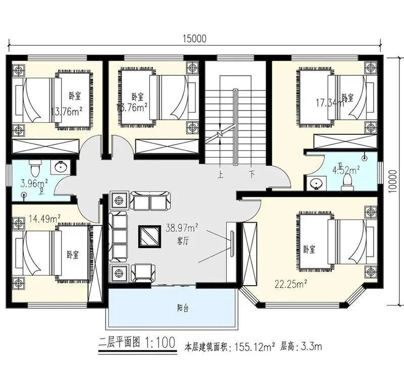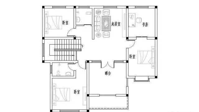 二层设客厅、3卧室、书房、卫生间、露台、阳台等。