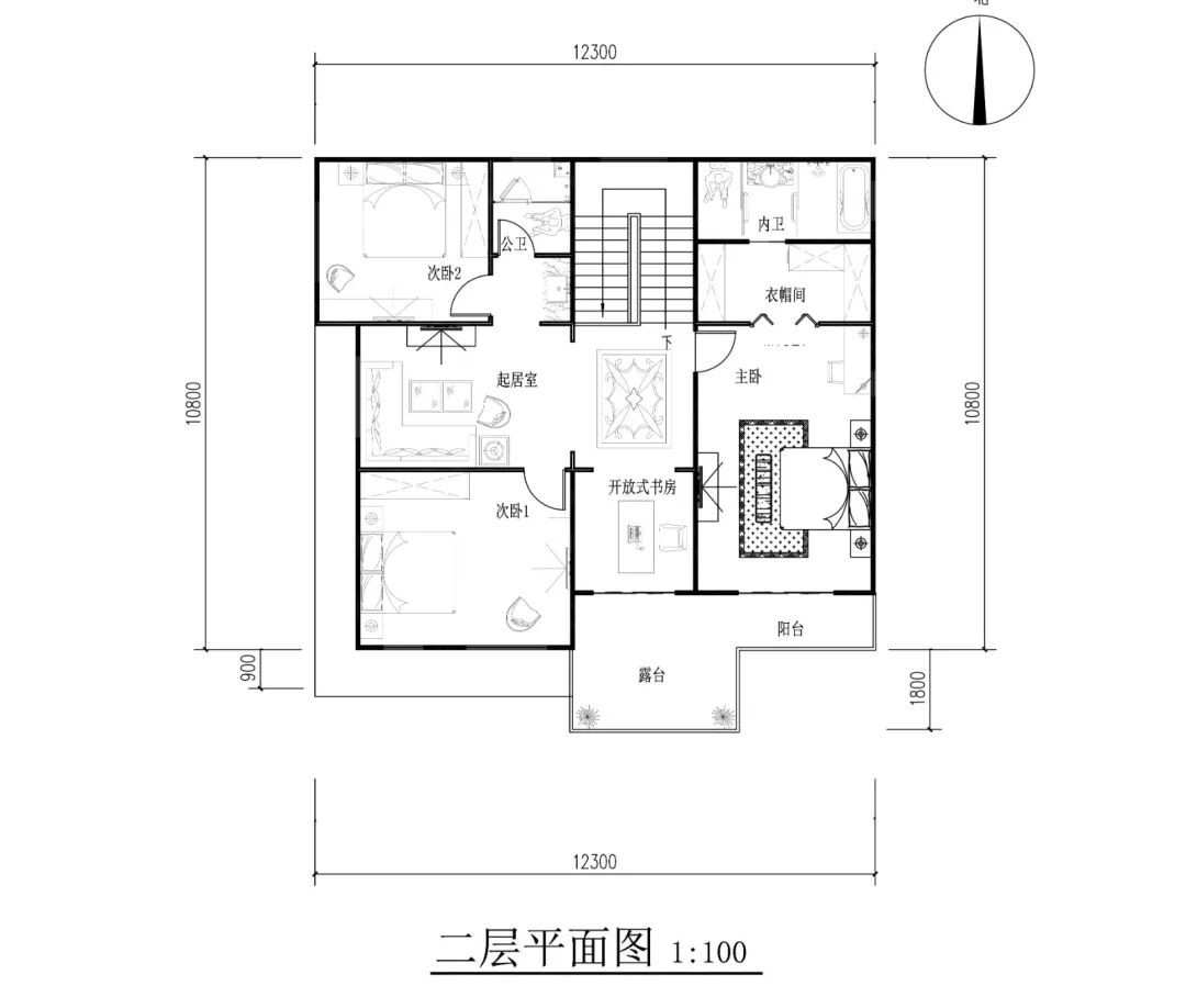 二层:起居室、书房、2次卧、公卫、主卧(附衣帽间、卫生间)、阳台。