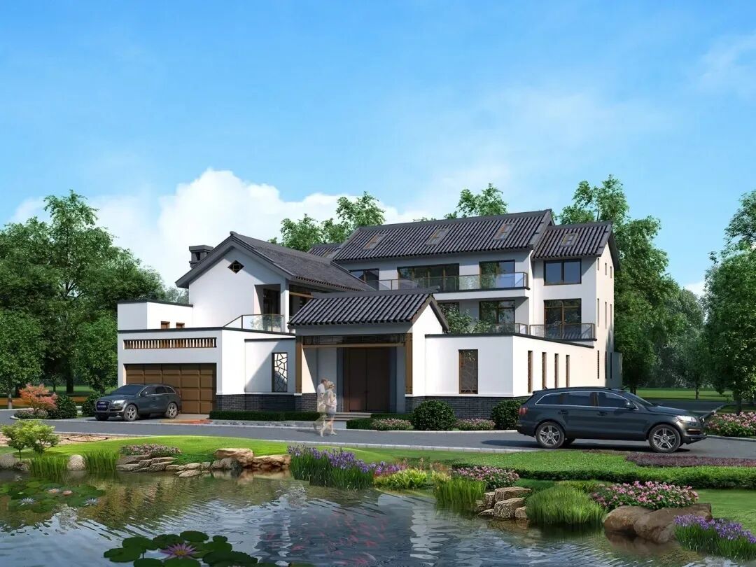 这款别墅新中式风格,外观造型古朴大方,色彩清新淡雅,富有古色古香的韵味。