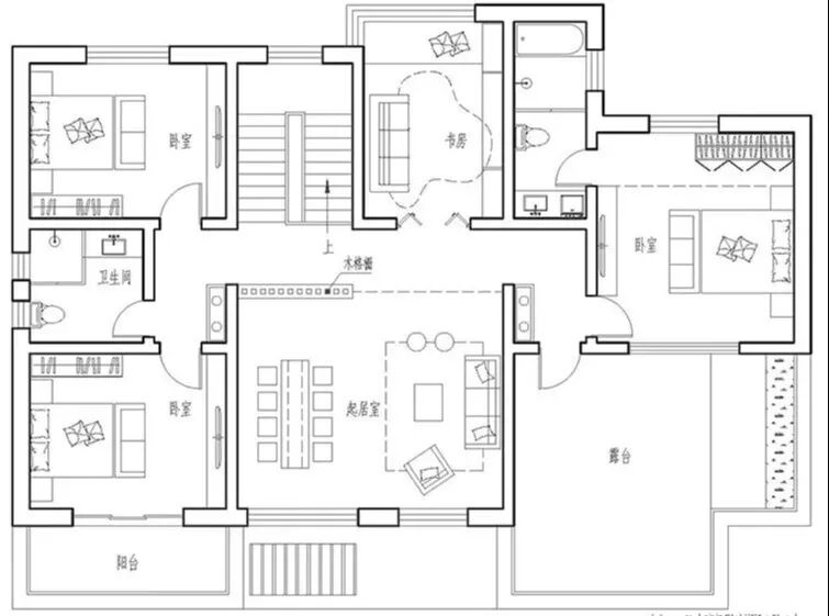 二层为主要的居住空间设健身房,书房、3个卧室、2间卫生间、1个阳台,一个露台。