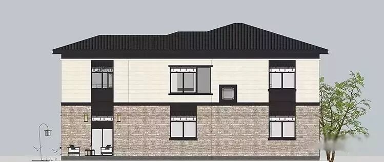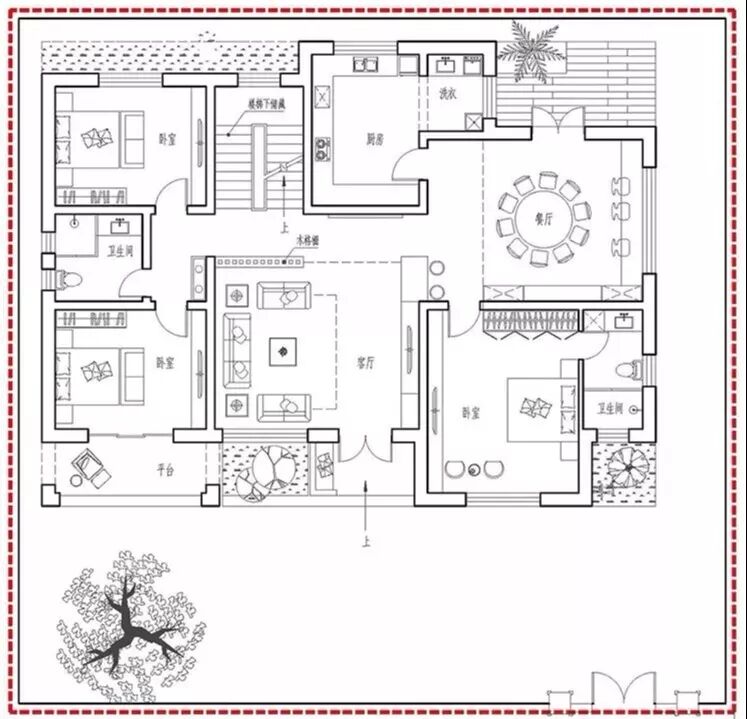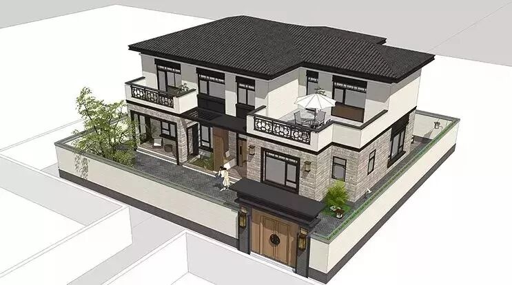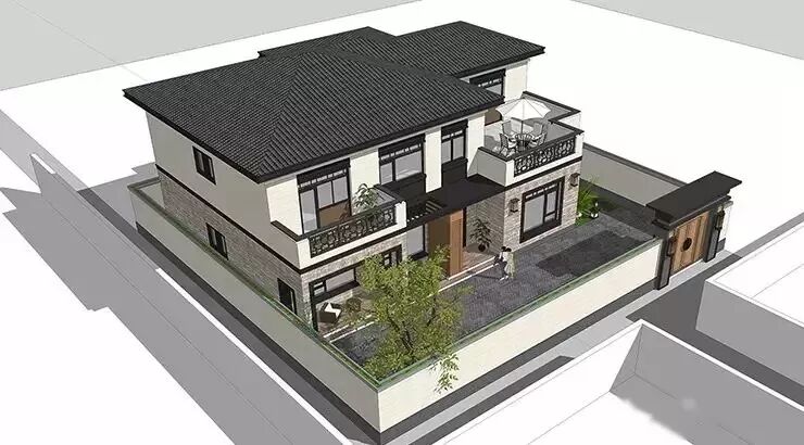 一层设小院子、客厅、餐厅、厨房、三间卧室、两间卫生间。
