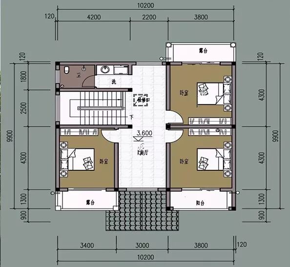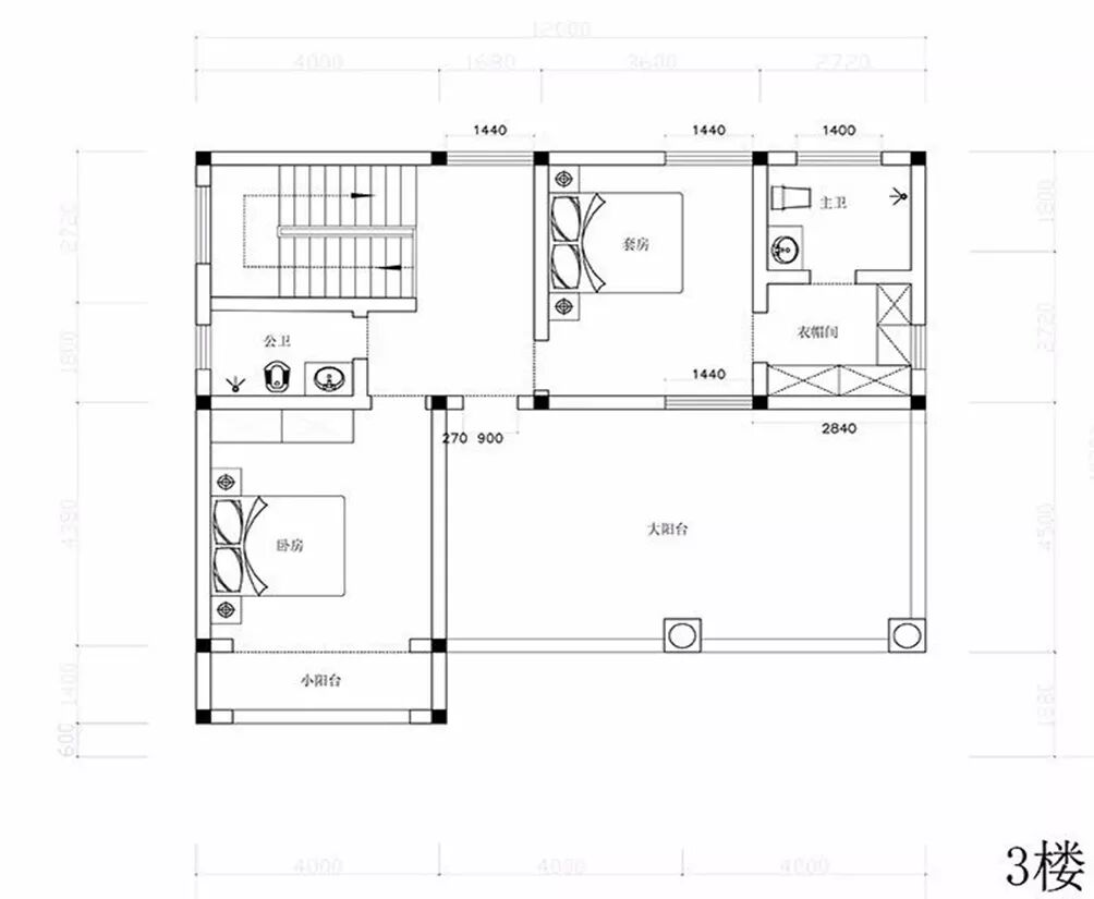 三层:卧室x2、卫生间x2、衣帽间、大阳台。