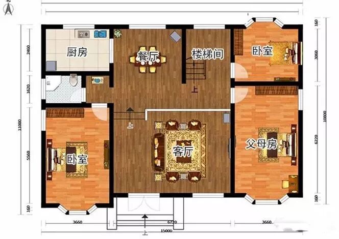 平面布局:一层:卧室x3、餐厅x1、厨房x1、客厅x1、卫生间x1。