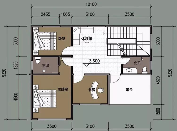 二层:主卧、儿童房、书房、卫生间、储物间、露台。