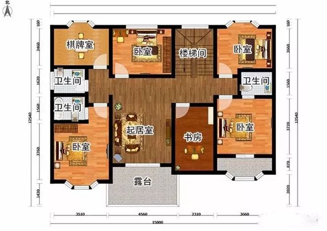 二层:卧室x4、起居室x1、棋牌室x1、卫生间x3、书房x1、露台x1。
