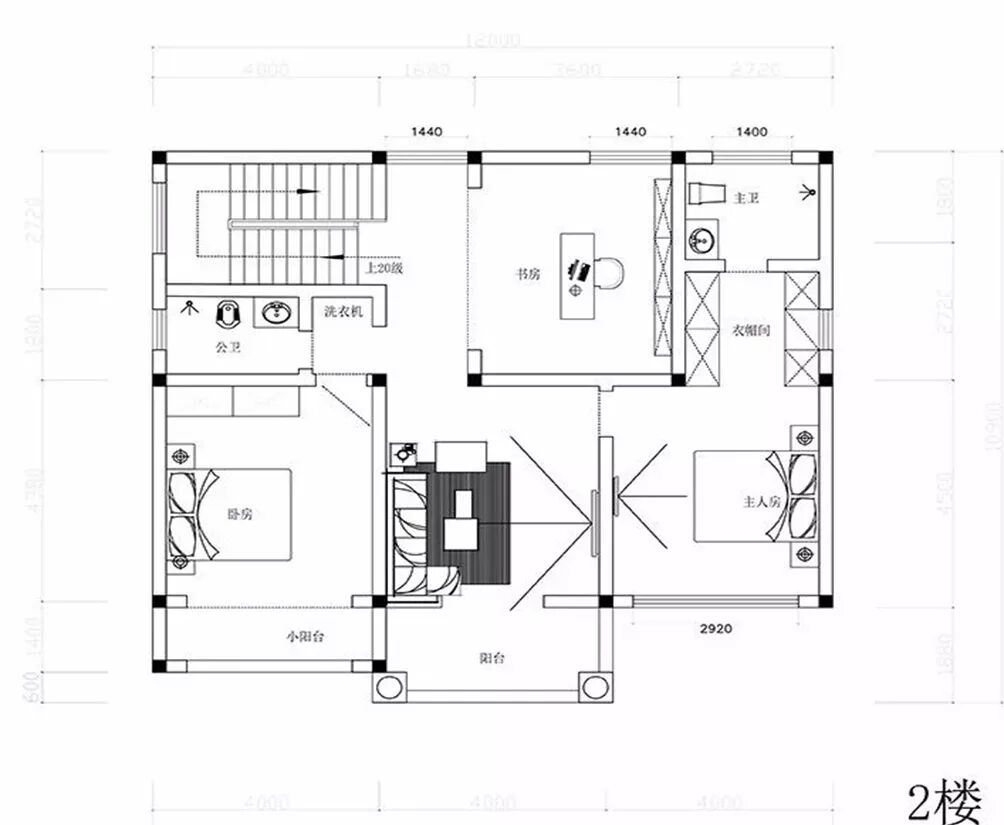 二层:主卧x1、次卧x1、书房x1、客厅x1、卫生间x2、衣帽间x2、阳台x2。
