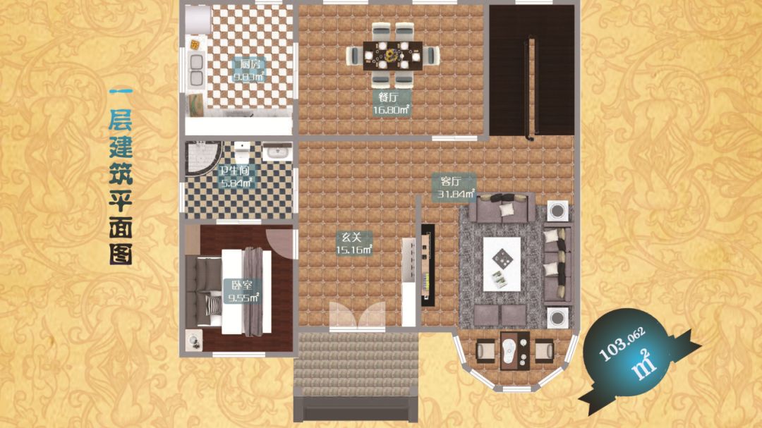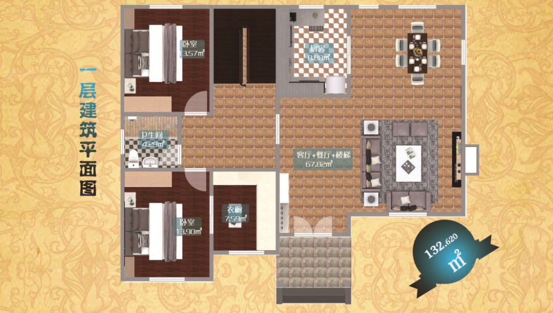 一层设客厅、厨房、餐厅、卧室。很标准的设计,也很方便日常生活。