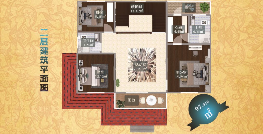 二层设卧室、棋牌室、露台,丰富家人的休闲娱乐生活。