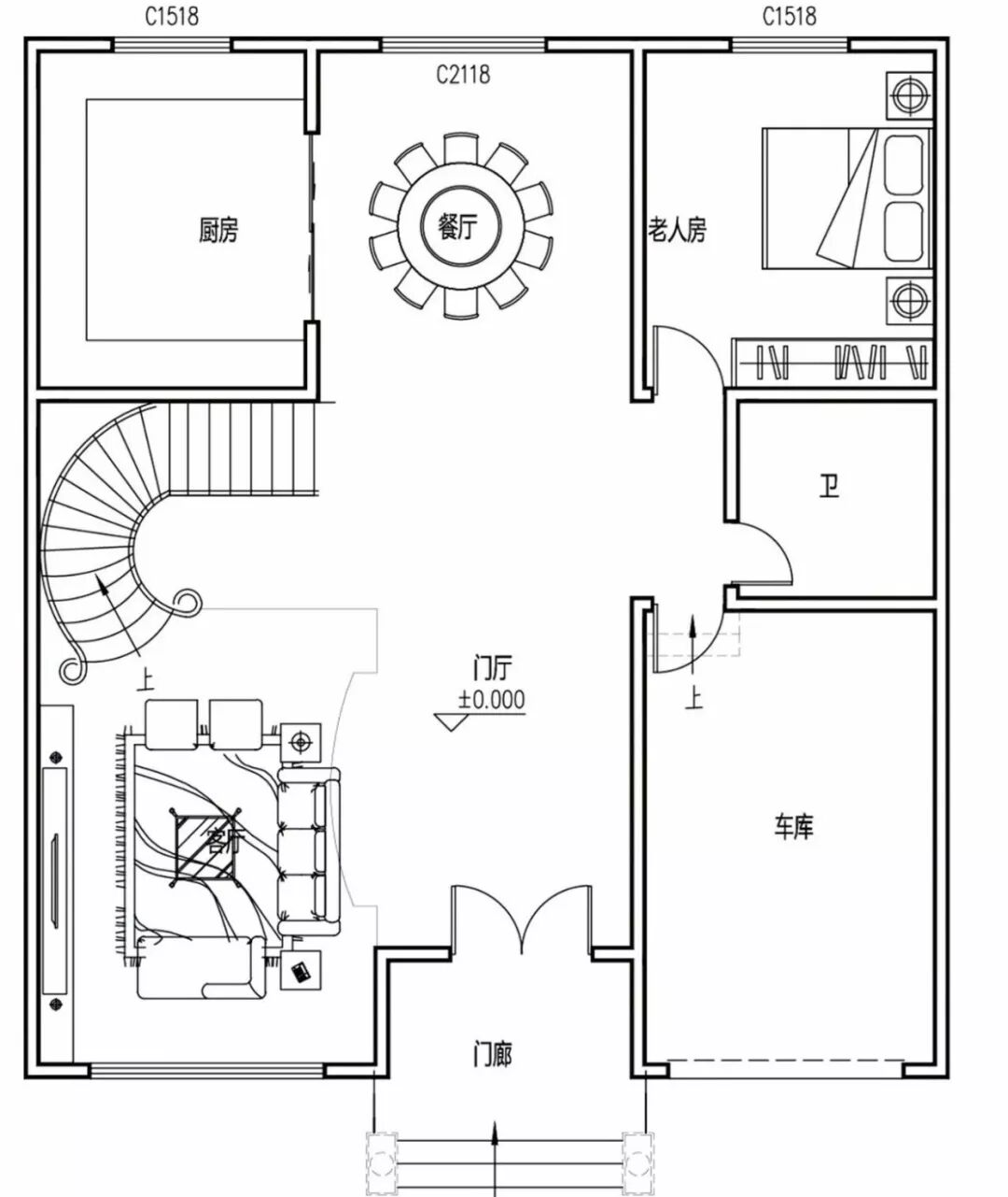 一层:门厅、客厅、餐厅、厨房、车库、老人房、卫生间;