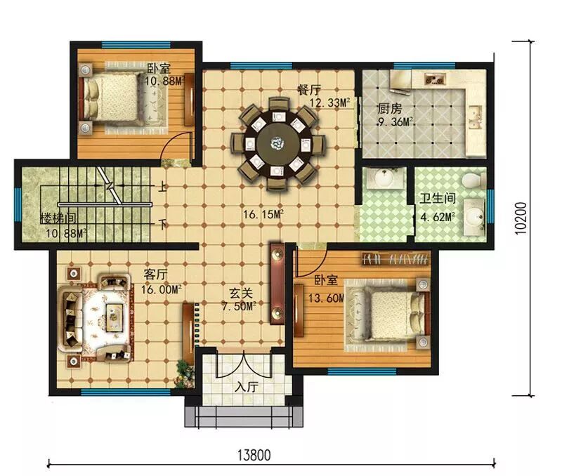 一层:玄关、客厅、餐厅、厨房、卧室×2、卫生间;
