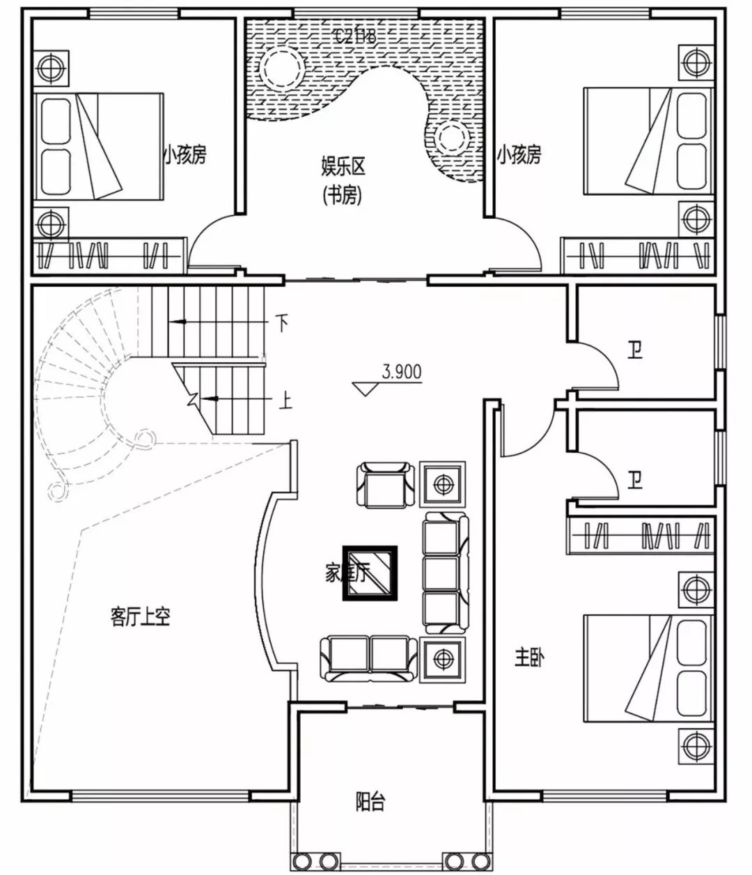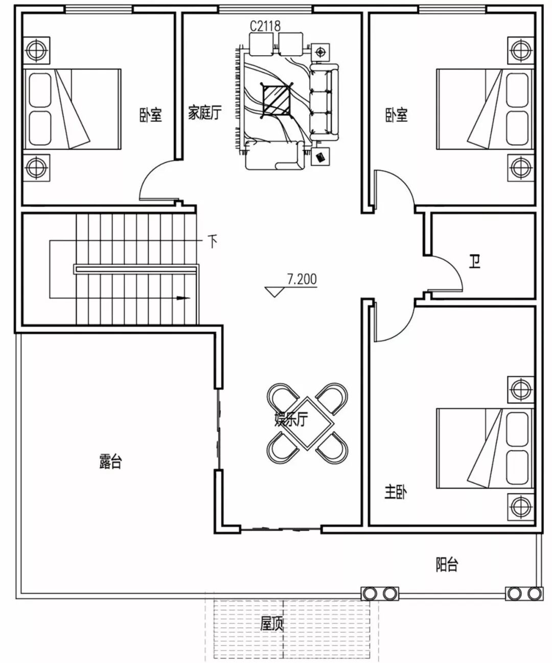 三层:卧室×3、卫生间、家庭厅、娱乐厅、露台、阳台。