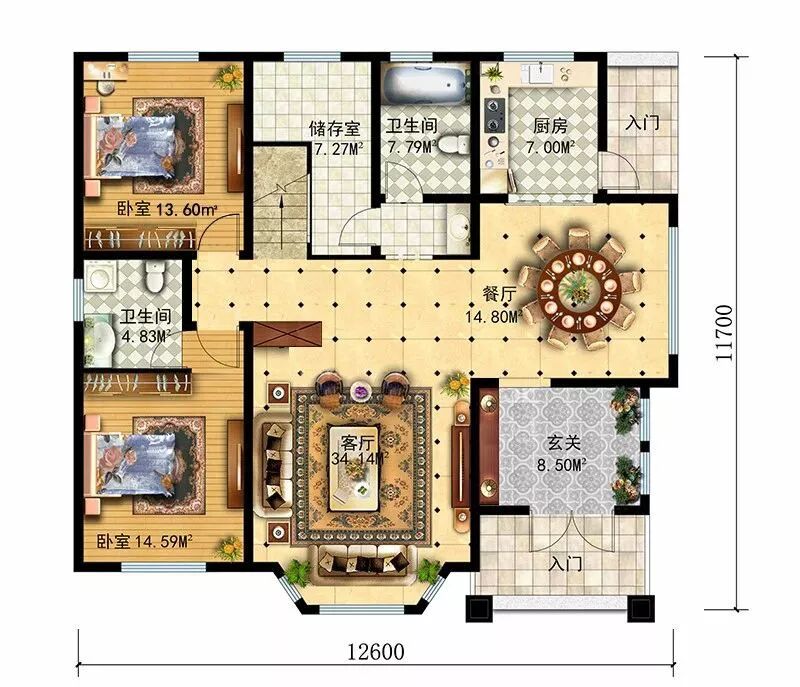 一层:玄关、客厅、餐厅、厨房、卧室×2、卫生间×2、储物间;