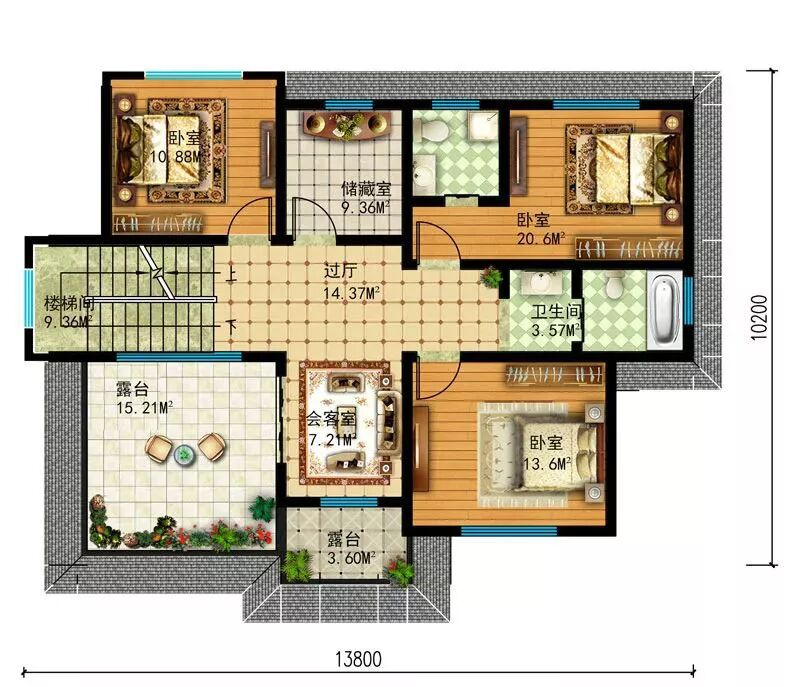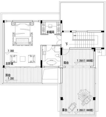三层:主卧(带独卫+衣帽间+阳台)、大露台。