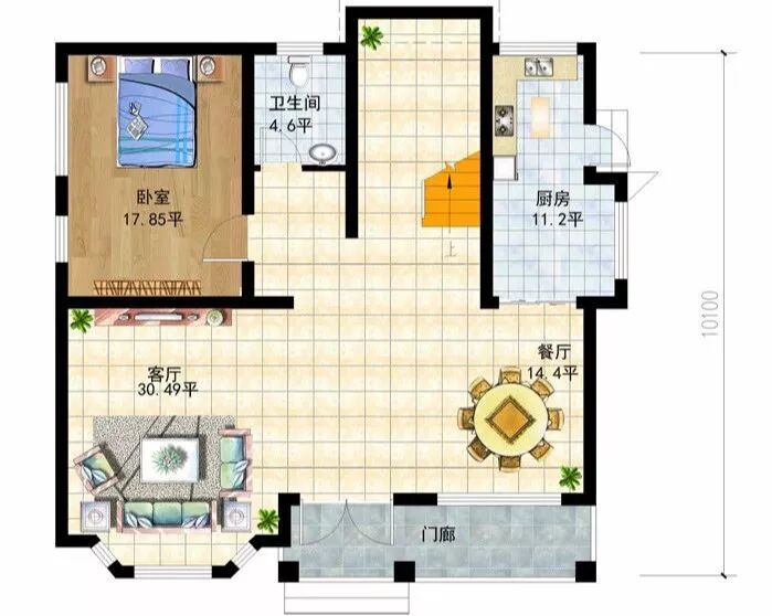一层:门廊、客厅、餐厅、厨房、卧室、卫生间、储物室;