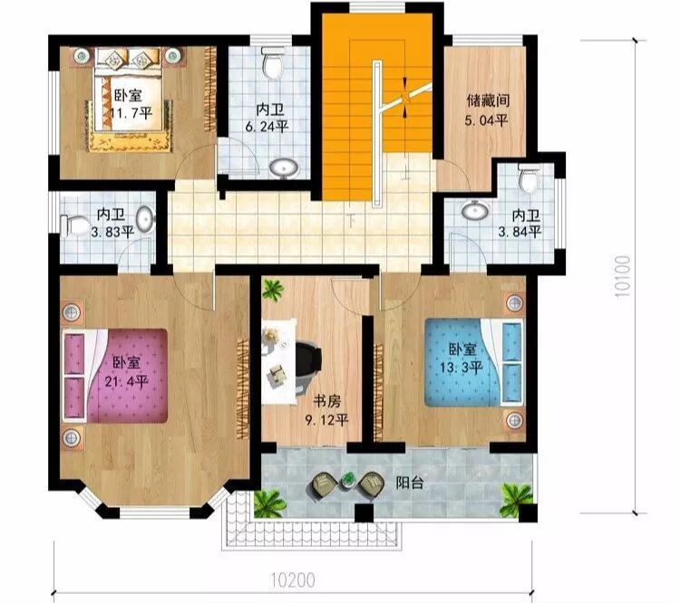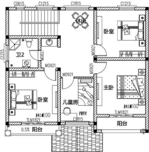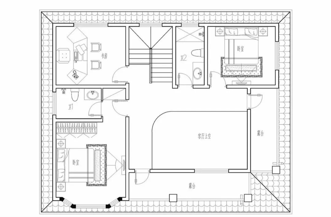 二层:卧室、书房、卫生间、露台。