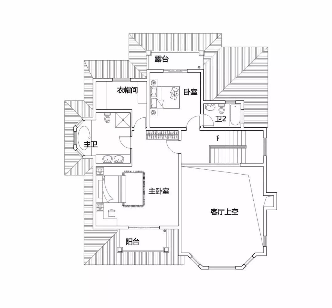 二层:主卧(带独卫+衣帽间)、次卧、露台、阳台、卫生间。