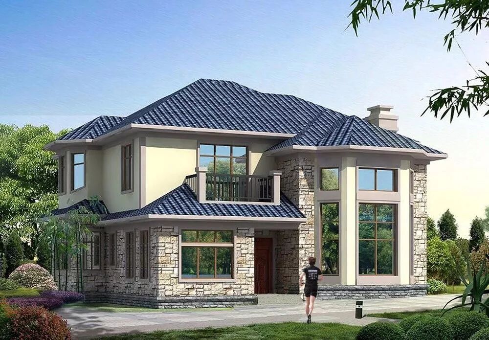●设计说明:美墅外观典雅别致,清新自然的米黄有机涂料与条石墙材结合,藏青色彩石金属瓦在多雨的季节不仅美观,而且降噪,门窗使用防辐射玻璃,调节室内温度的同时,起到更好的装饰效果。