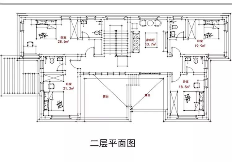 二层:卧室×4、阳台×2、卫生间。