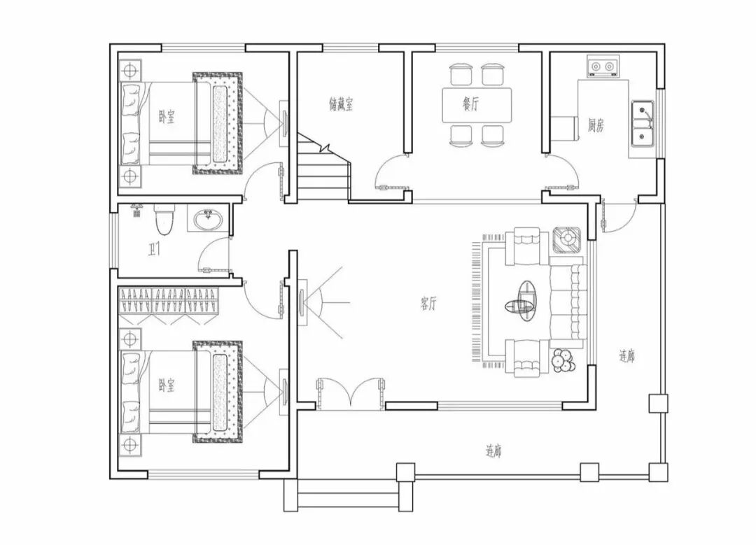 一层:外廊、客厅、餐厅、厨房、卧室×2、卫生间、储藏室;