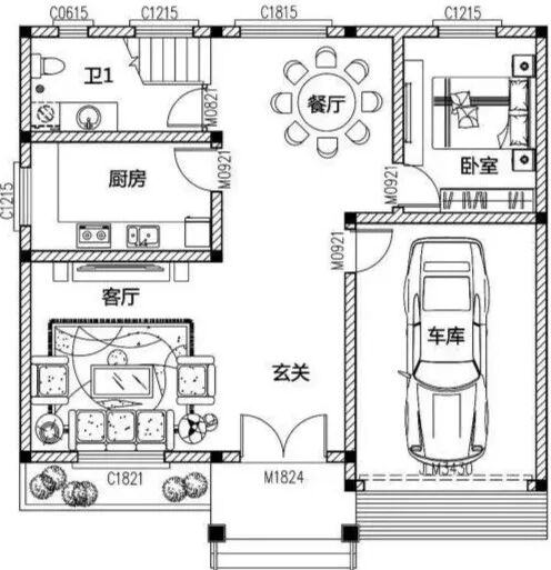 一层:玄关、客厅、餐厅、厨房、卧室、卫生间、车库;