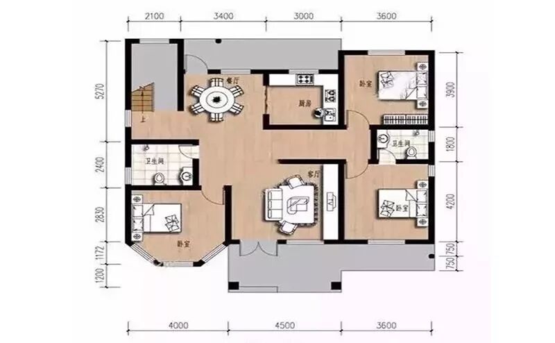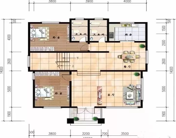 一层:客厅、餐厅、厨房、卧室×2、主卧(带独卫)、卫生间;
