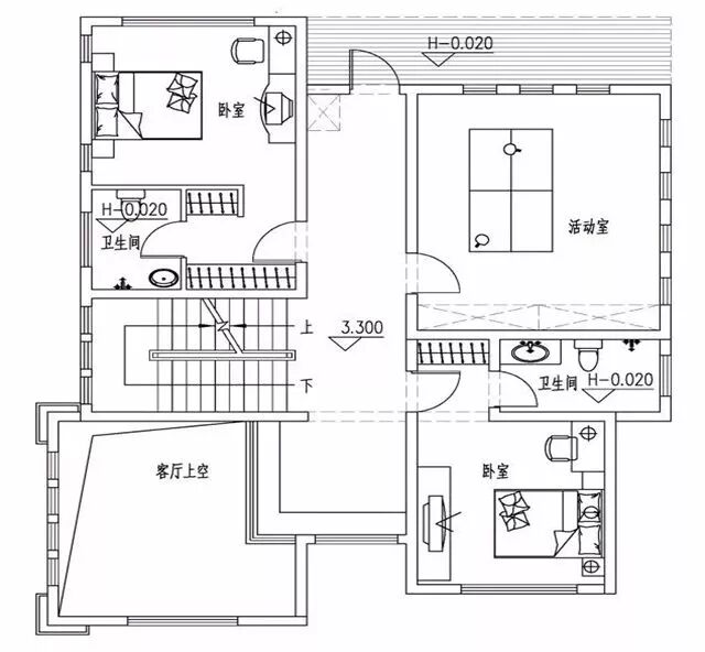 二层:主卧(带独卫+衣帽间)×2、活动室、露台×2;