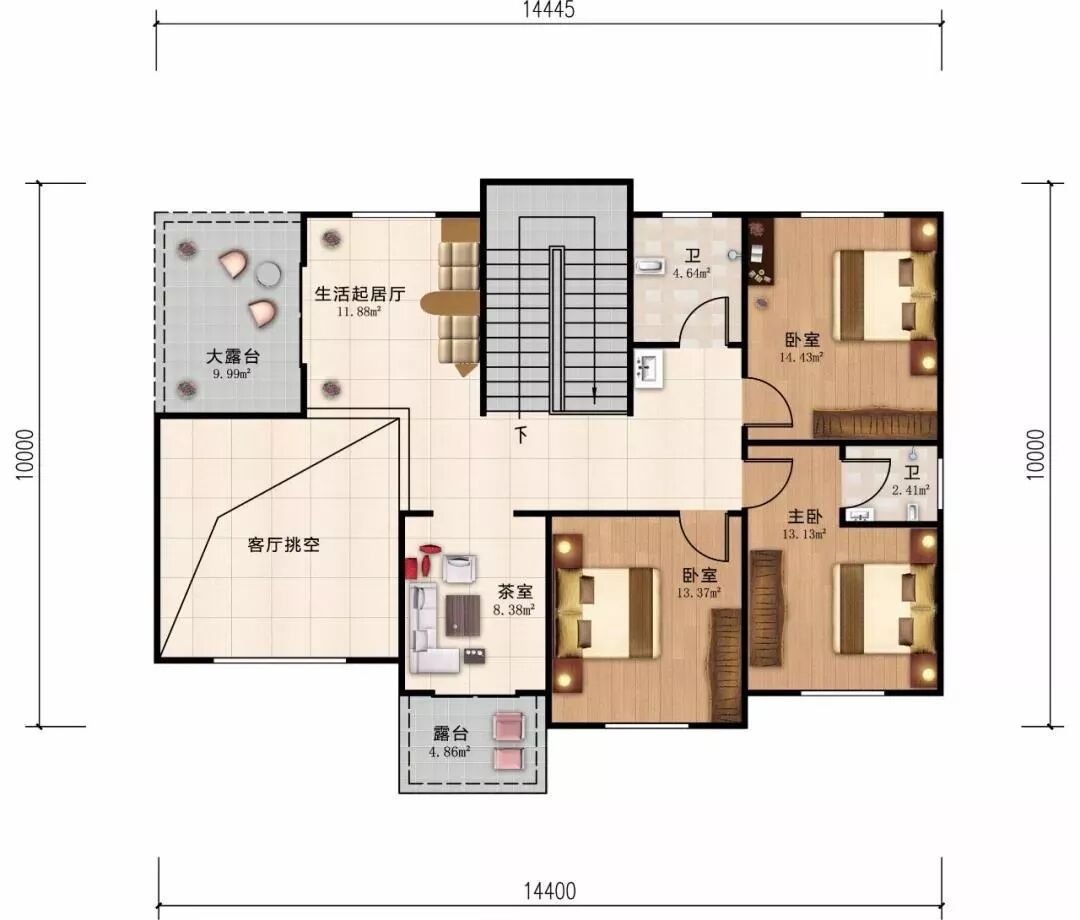 二层:卧室×2、主卧(带独卫)、卫生间、起居室、露台×2、茶室。