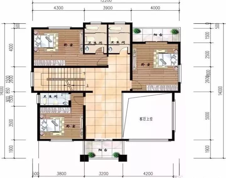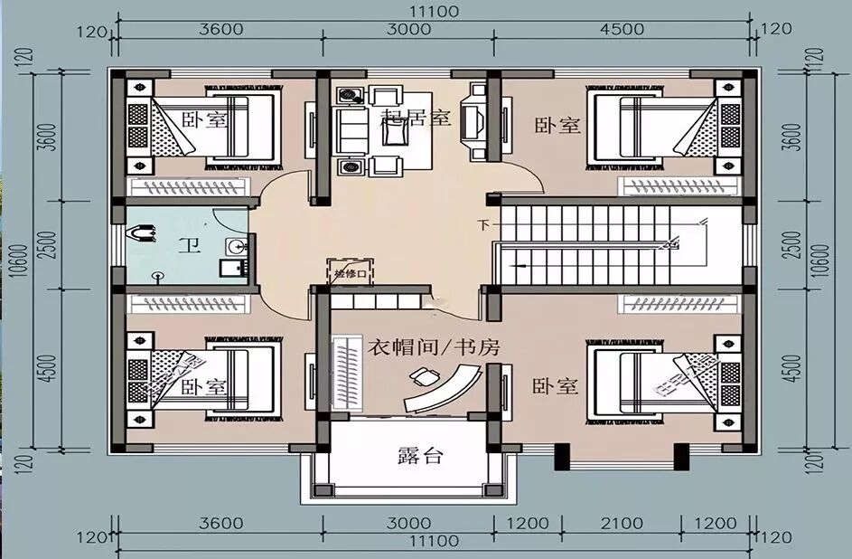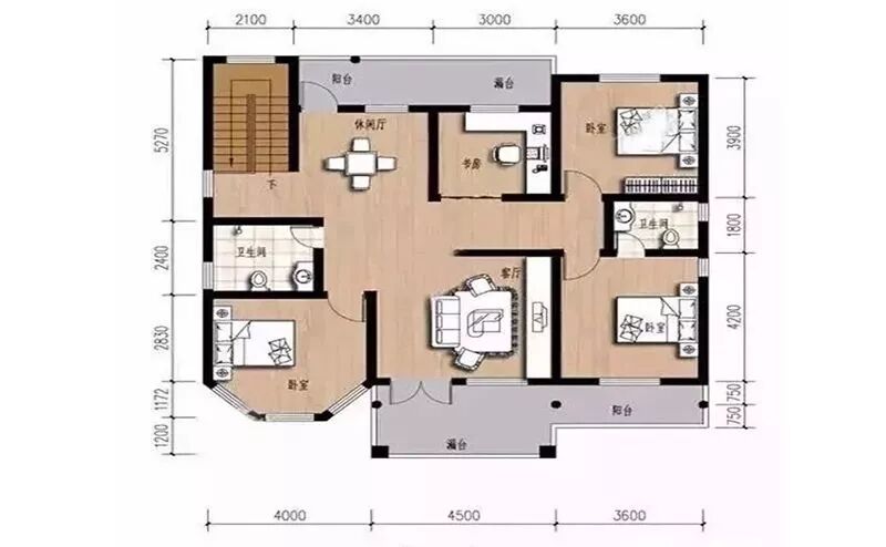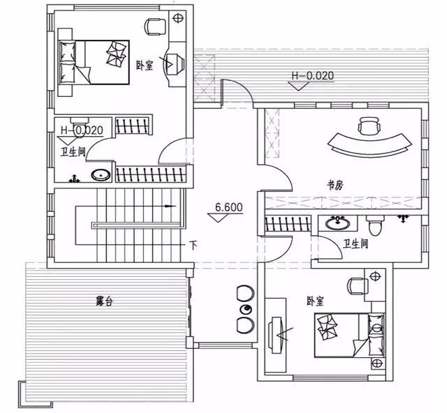 二层:卧室x4,卫生间、客厅、书房、露台。