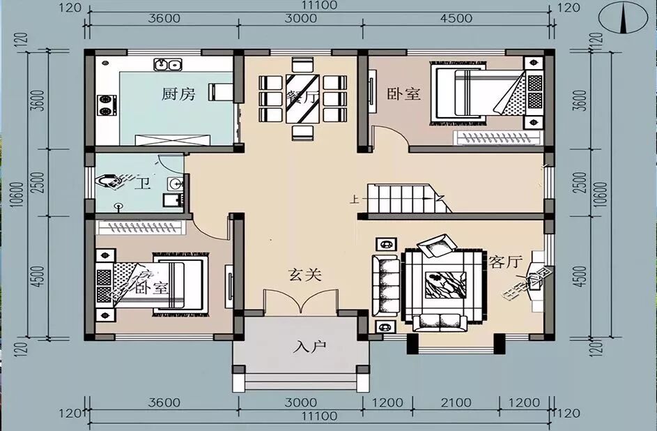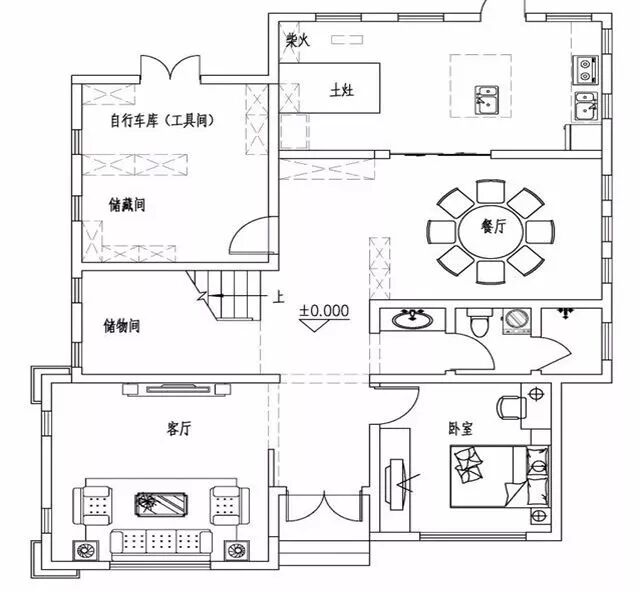 一层:玄关、客厅、餐厅、卧室、卫生间、储物间、柴火房、储藏室;