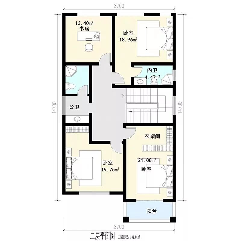 二层:3卧室、书房、衣帽间、2卫生间、阳台。