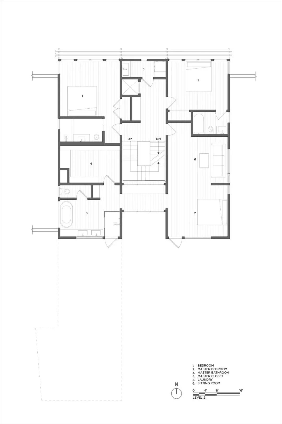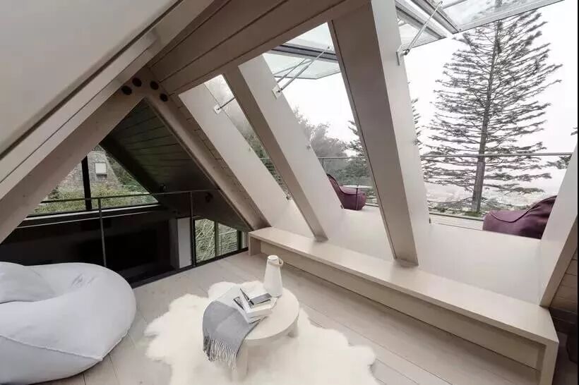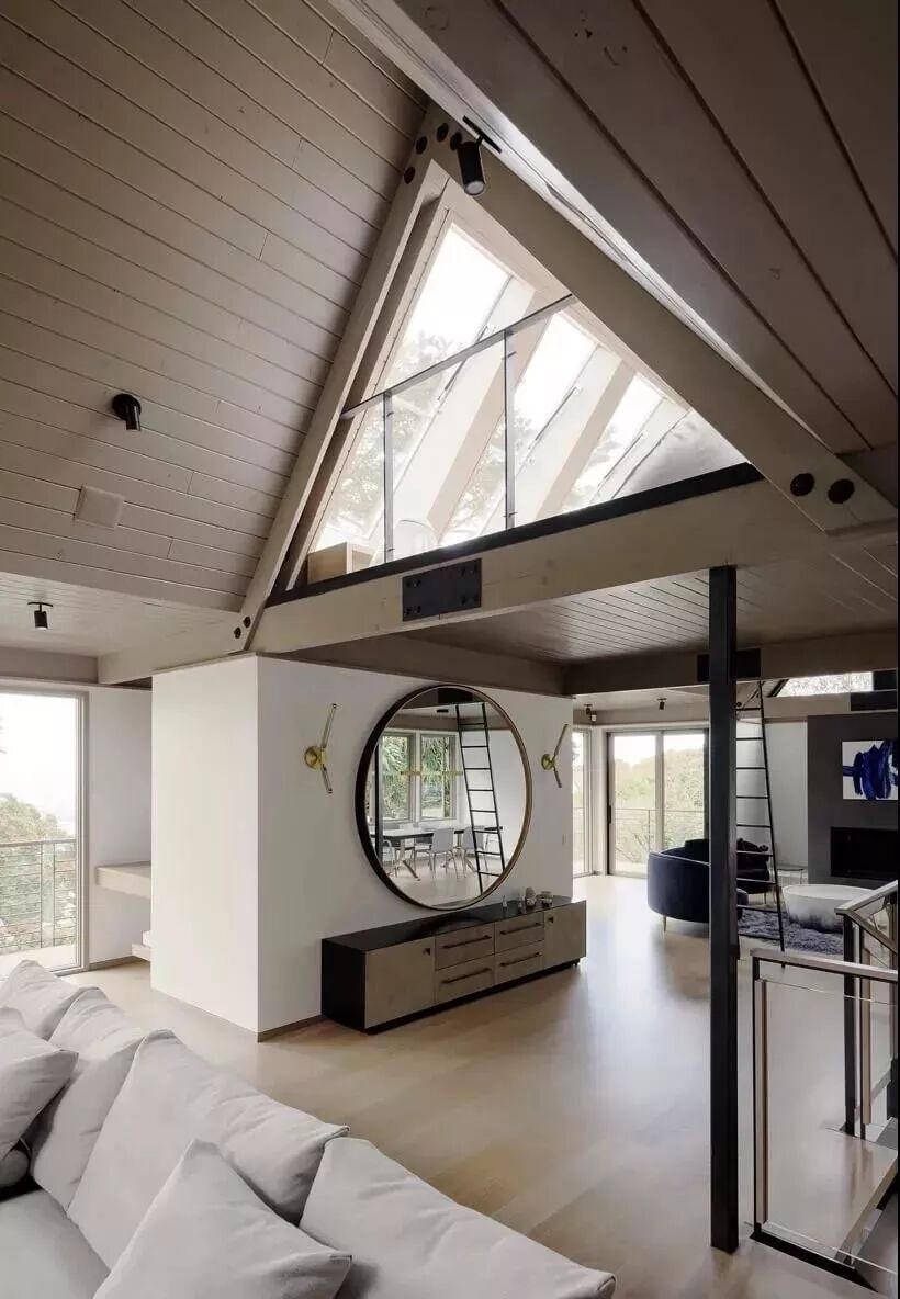 在倾斜的天花板和蝴蝶状的天窗下有着一个舒适的阅读角落,可以直接进入一个新的屋顶平台,并可欣赏到金门大桥的景色。