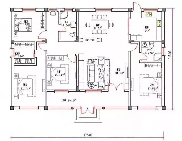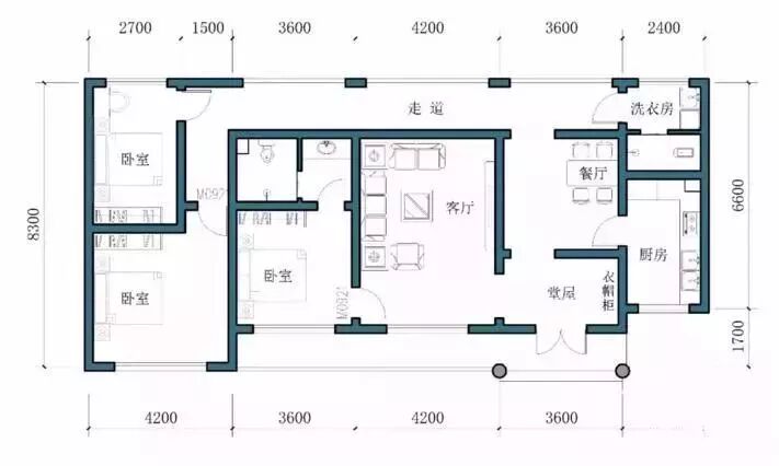 一层设有:走廊、客厅、厨房、餐厅、主卧(带主卫)、次卧(带衣帽间)、次卧×2、公卫