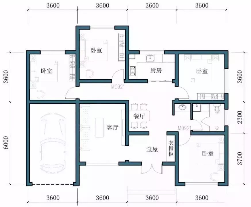 一层设有堂屋,卧室(4间),客厅,卫生间,厨房,车库,餐厅。