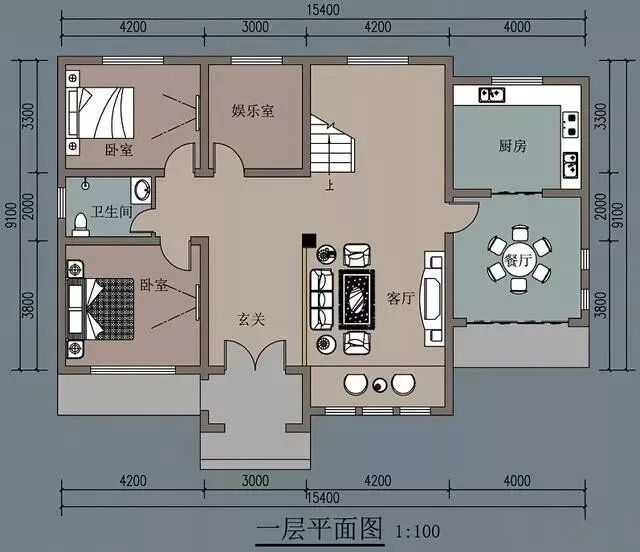 一层平面图上可以看见,客厅和卧室都在阳面,室内光线好。而卧室挨着卫生间,方便一层老人居住使用。除了厨房和餐厅外,一个亮点是棋牌室,布局在这个位置也是挺合适的,离哪儿都近。