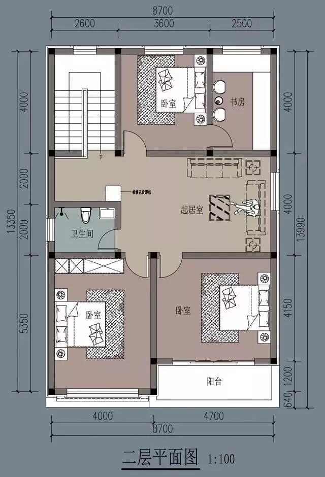二层平面图,有三间卧室和起居室以及卫生间。其中一间卧室里间是书房,睡觉前看会儿书,很不错。另两间卧室向阳,其中一间外有阳台,还可以站在室外看看风景。起居室其实也可以改成健身房,这样就更完美了。当然,改成别的功能用房也可以。