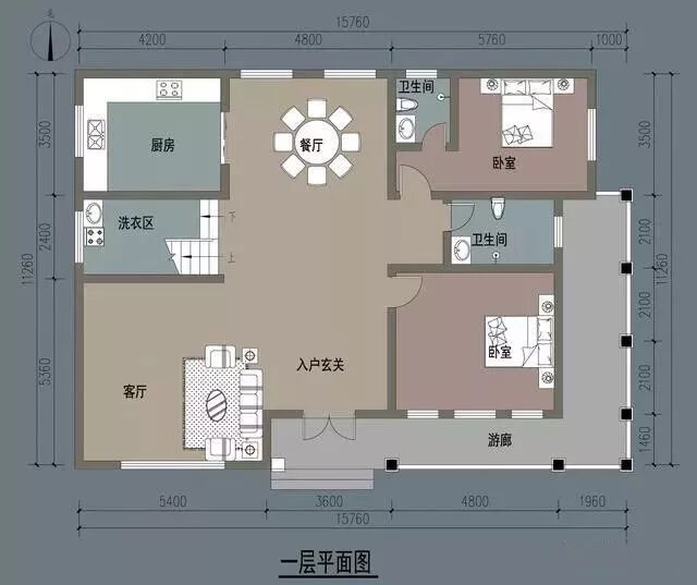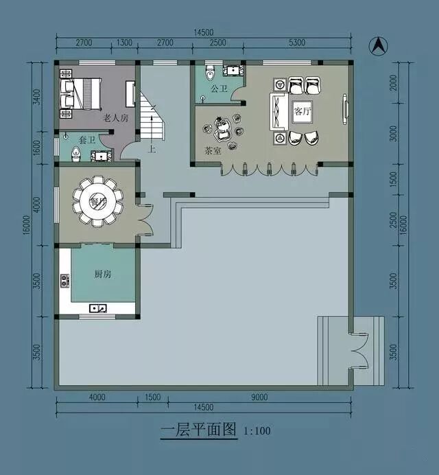一层平面图上,可以看到,这座小院宽14.5米,长16米,作为一个院子来说,占地并不大。从平面图上可以看到房屋有院子的优势,可以把厨房甩出来,主体只保留客厅 、卧室和餐厅就可以,又干净,又方便,还扩大了各个房间的面积。从平面图上我们就可以看到,客厅有独立的卫生间,并有专门喝茶的区域,而且客厅很大,5.3米*5米这样一个活动区域,真是太宽敞了。旁边的老人房带有独立的卫生间,生活很方便,且与客厅隔开,即使有客人在客厅,也不会影响老人休息。而独立的餐厅,总让来访的客人有倍受重视的感觉。因为比较正式,全家人吃饭时也会养成良好的用餐习惯。