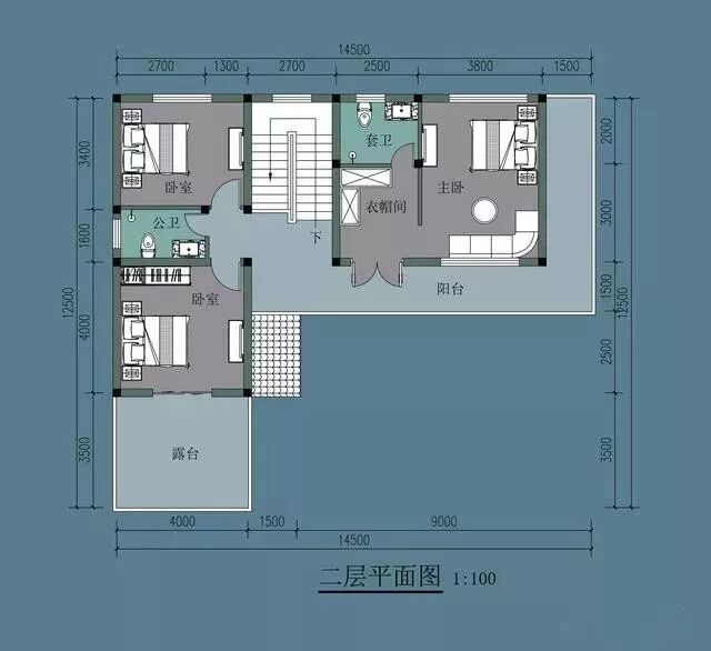 二层平面图上,是三间卧室和大露台。可以看到从楼梯上来,一边通往主卧,一边通往次卧。主卧自带卫生间和衣帽间,还有空间摆放书架等等。两间次卧共用一个卫生间,完全够用。从布局来看,卫生间都是上下相通的,便于外理,而且二层的卫生间,就在一层的上面,不在别的其他房间之上。露台上可以喝茶看报,看看远处的风景,还可以晾晒粮食。
