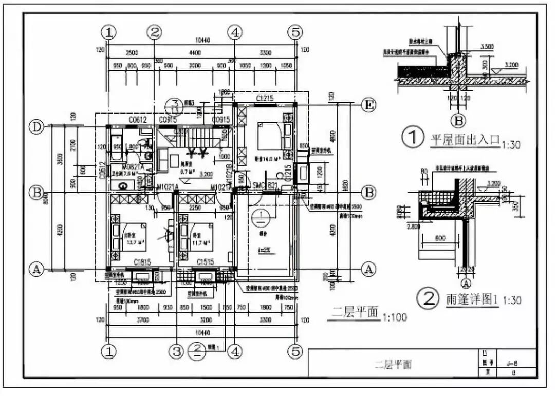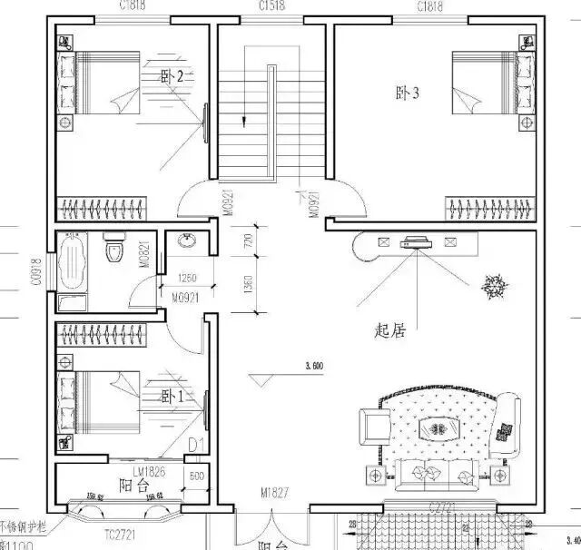 二层:起居室(附阳台)、卧室、楼梯、卧室、卧室、卫生间。