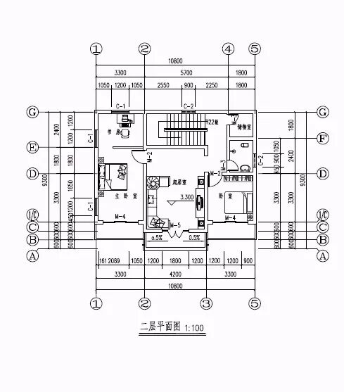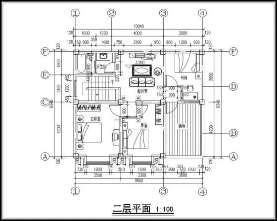 二层:起居室、卧室、卫生间、储物室、主卧室(附阳台和书房)。