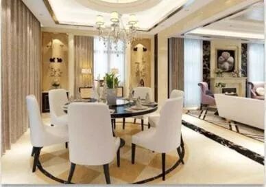 餐厅沿用客厅的华贵风格。石膏线、玻璃、壁纸、涂料体现出欧式的美感。欧式风格独特门套及窗套的造型体现出欧美风情。