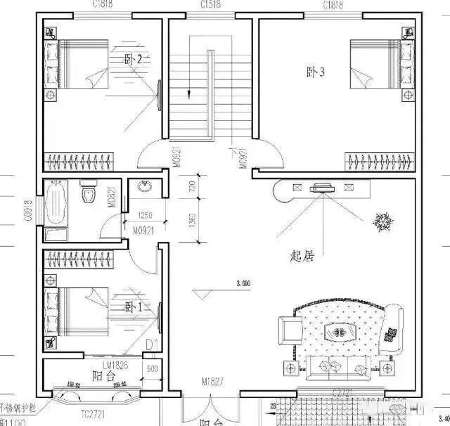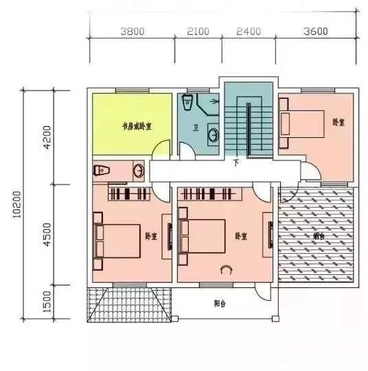 二层:起居室(附阳台)、卧室、楼梯、卧室、卧室、卫生间。