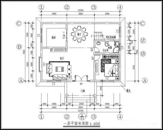 一层:门廊、客厅、卧室两间、卫生间、餐厅;