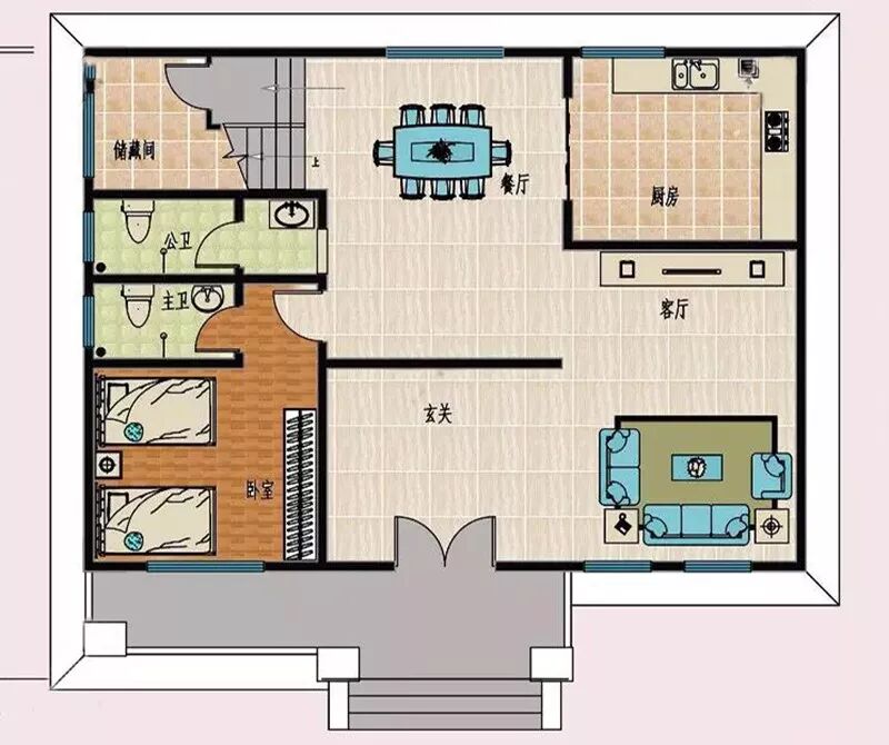一层入户前是个走廊,入户是一个大玄关,往右是客厅,再往里是厨房和餐厅,一层的左侧是一个卧室套房,双床设计,1人1床,各不干扰,套房内带私卫,方便生活。套房外面是一个干湿分离公卫,楼梯设计在最北面,楼梯下方充分利用空间,设了一个储藏间。