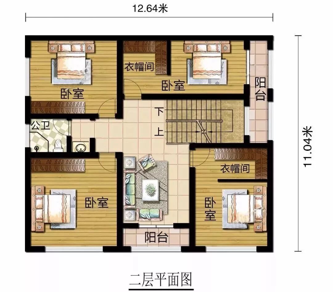 二层设两个衣帽间、四间卧室、一间卫生间、两个阳台。二层为主要的起居空间。晚上睡觉之前,一家人可以在客厅聊聊天,尽情享受温馨的家庭生活。布置的四间卧室,都带有采光通风窗。其中两间带有衣帽间,方便家中衣物被褥的存放。两个封闭式的阳台阳光充足,适合莳花栽草,晒衣待干。