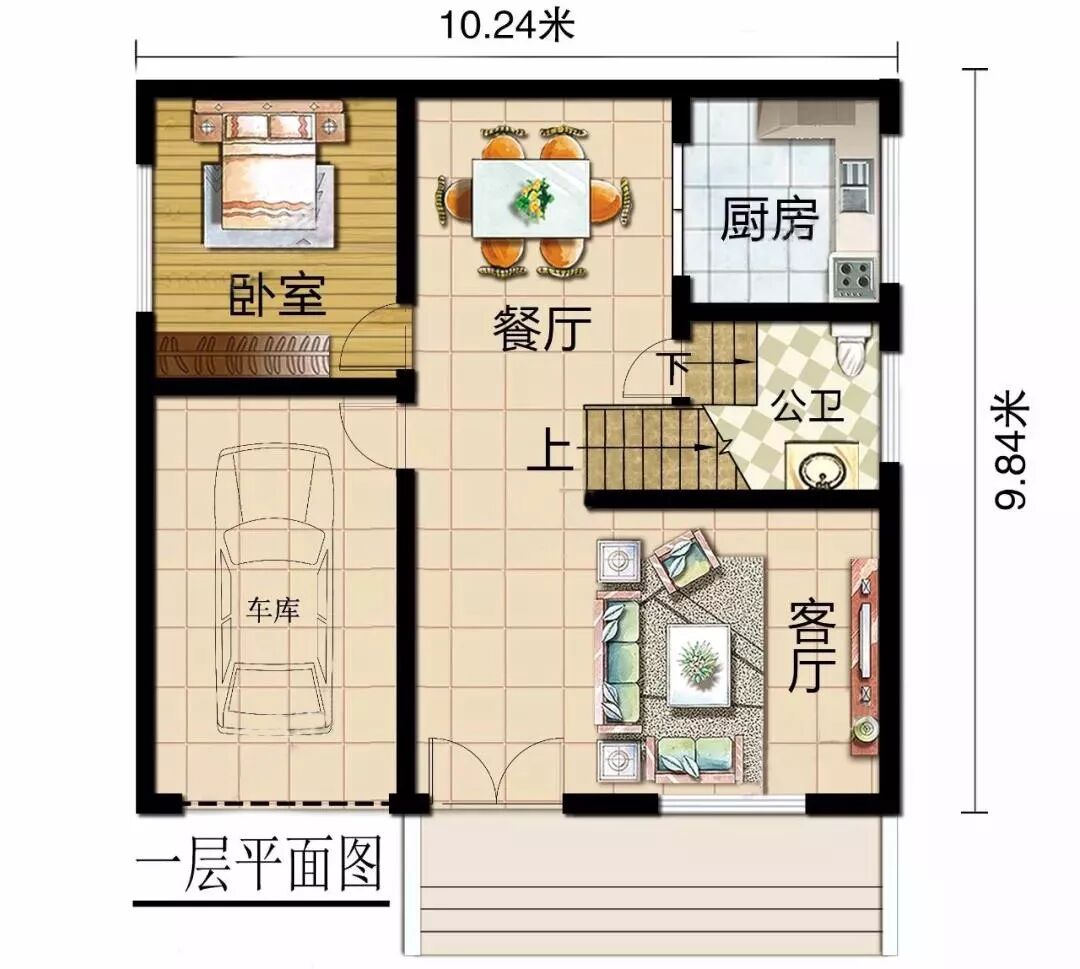 一层设有:客厅、餐厅、厨房、车库、一间卧室、一间卫生间。