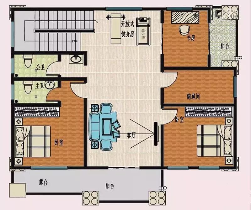 二层设有:客厅、主卧套房、次卧、储藏间、书房、公卫、健身房、双阳台。