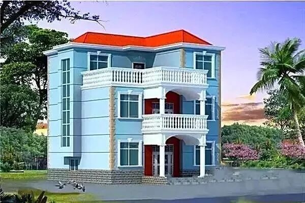 这款户型最大的特色就是它的土豪气息十足,不说它外观阳台露台繁多,造型错落起伏,只看它室内的旋转楼梯和大大的半圆状挑空客厅,一股浓郁的富贵气就扑面而来!再加上它色彩明快的天蓝色波形琉璃瓦,矗立的罗马柱,阔气的落地窗户,一眼看上去,就不是寻常百姓家啊!