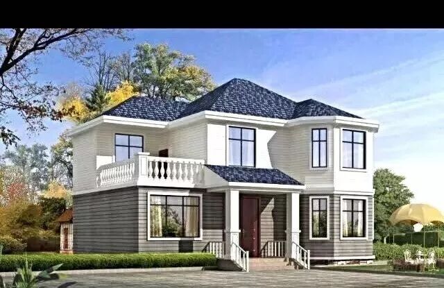 本户型外墙采用灰白色和白色水泥植物纤维挂板,外观造型简洁大方,色彩清新淡雅,房间尺度设计适宜,空间利用率高,明厨明卫,各使用空间都有较好的采光通风,适宜建造于平坦地带。