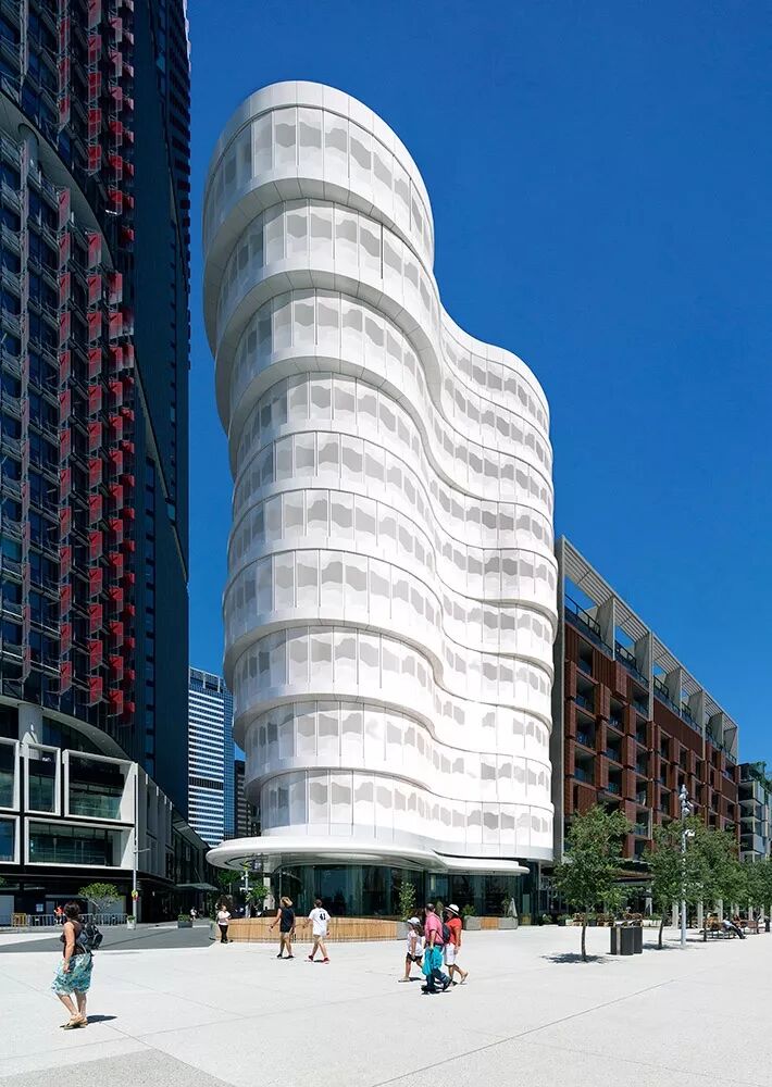 公寓富有表现力的有机形式定义了相邻的公共广场,同时也体现了云朵与海浪的自由形式,让人们联想到自由的海港。