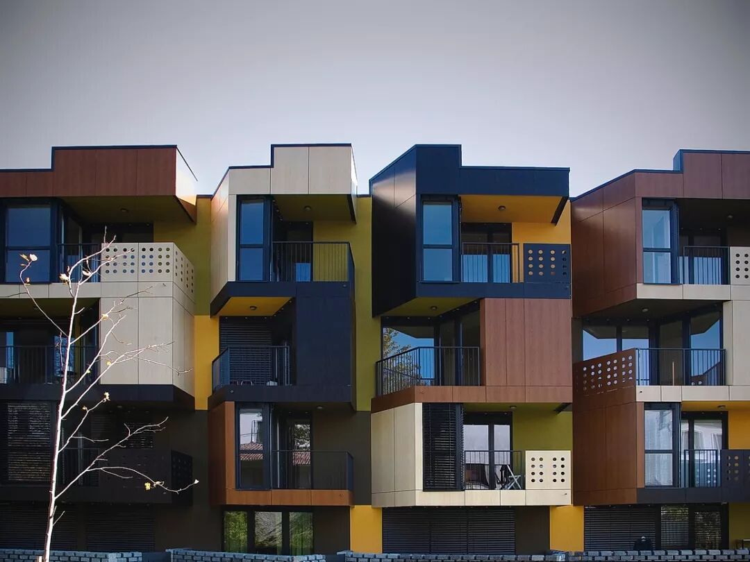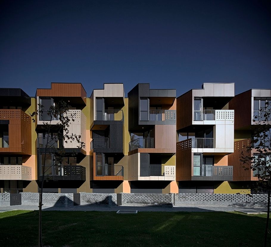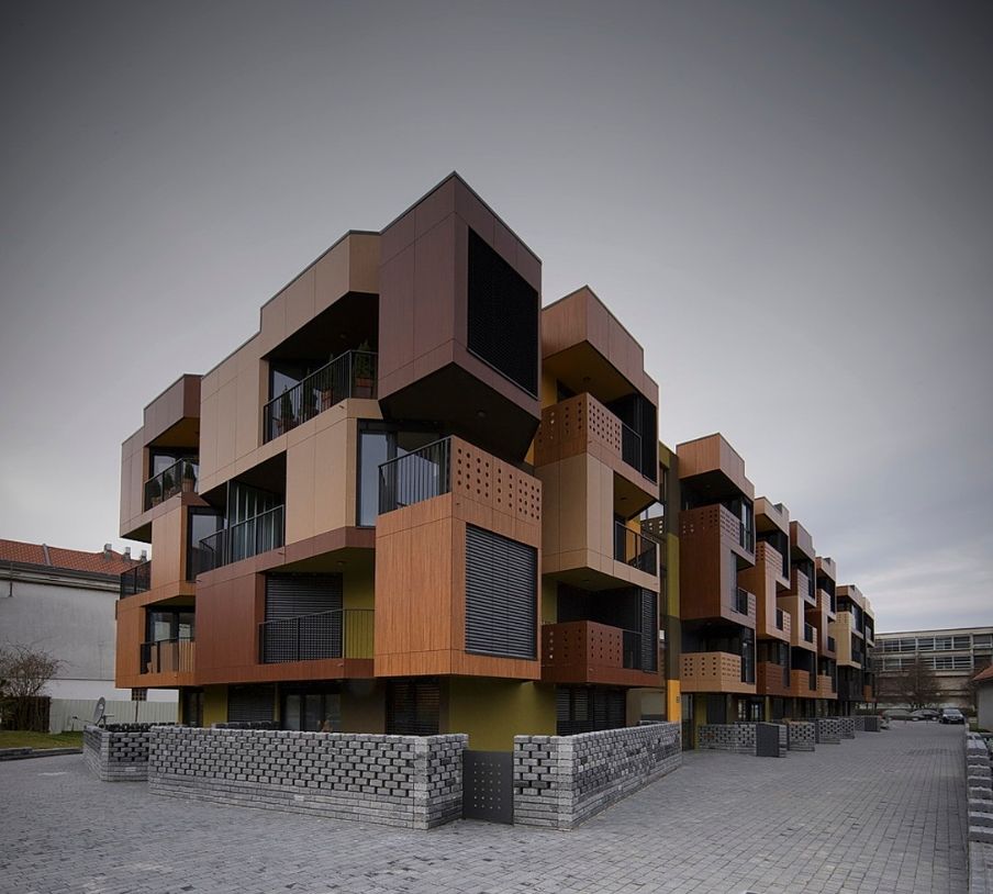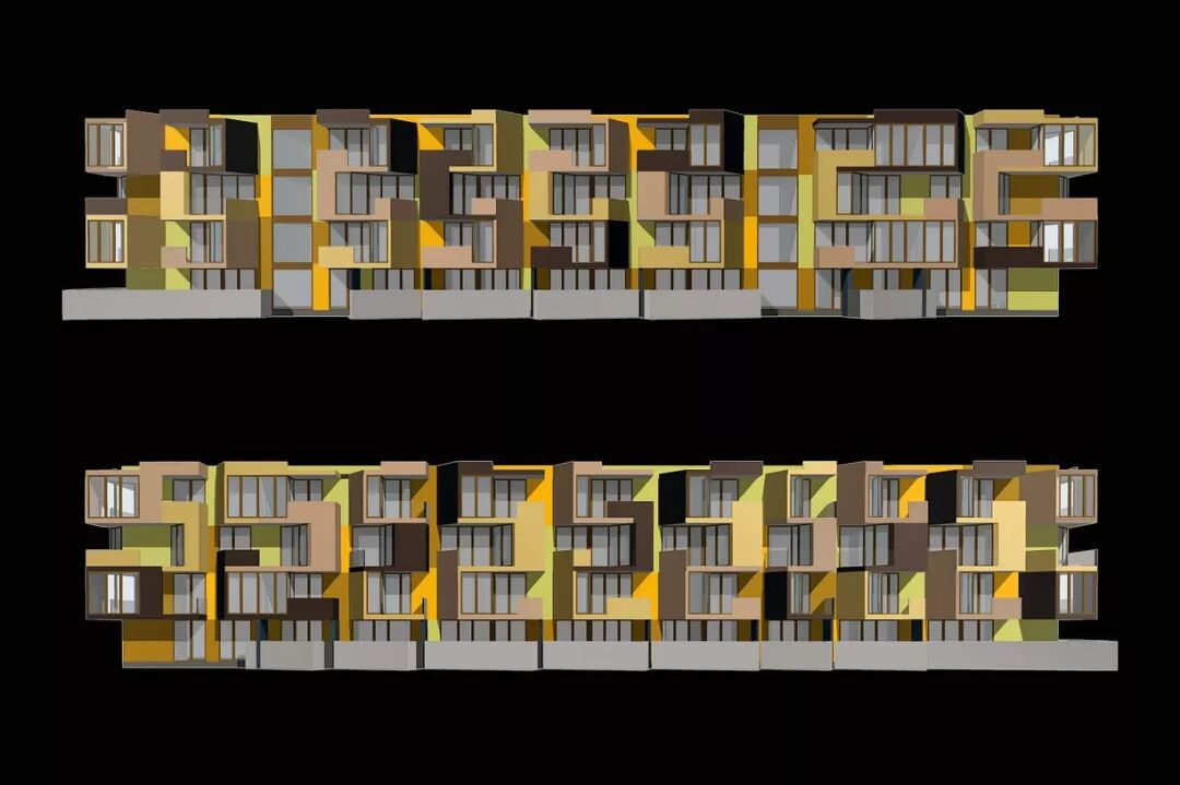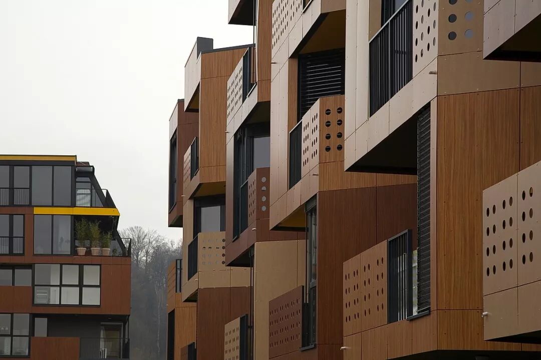 公寓的外墙采用的是预制墙板,这些墙板援用了木制的三种颜色,沿垂直方向错落设计。